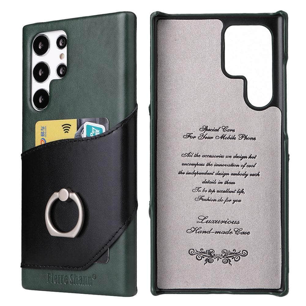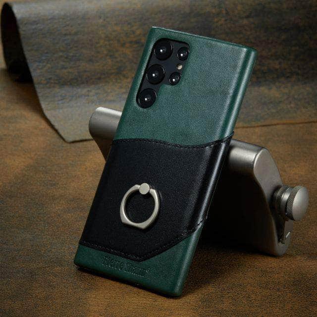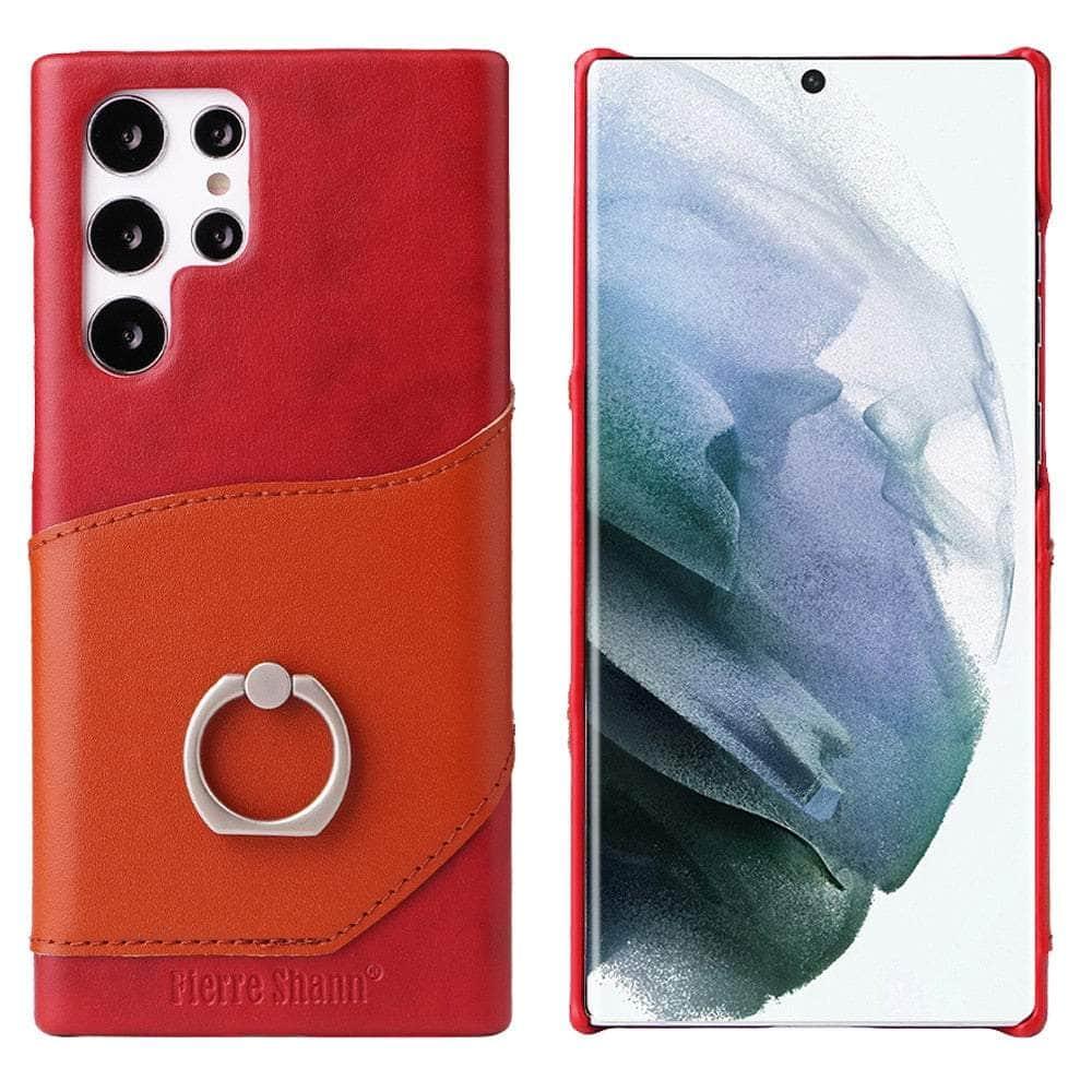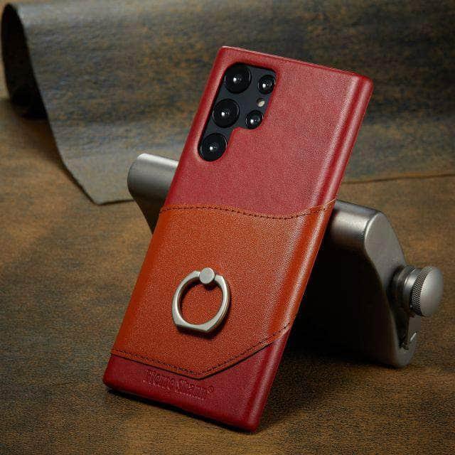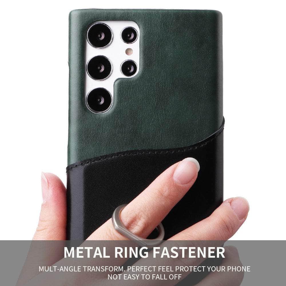 Genuine Leather Back Cover Metal Ring Finger Holder S22 Ultra Card Pocket