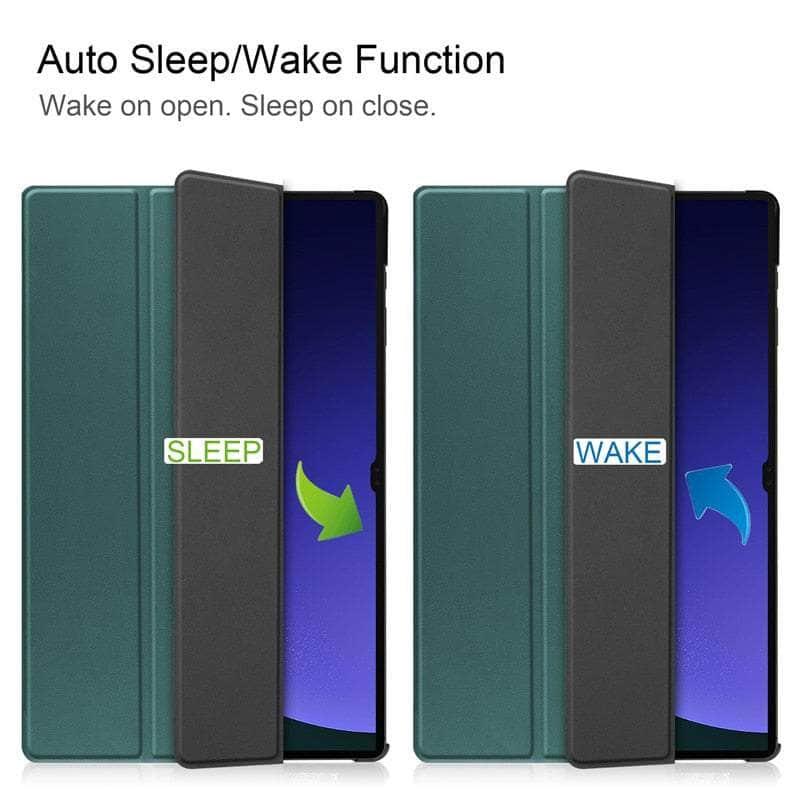 The Tab S9 Ultra Trifold Magnetic Leather Stand provides a sturdy, secure hold for your tablet. Its powerful magnets ensure your device stays securely in place while the leather exterior offers sleek aesthetics and durability. The trifold design allows for a convenient, space-saving storage and transport.